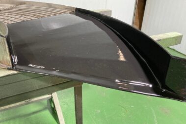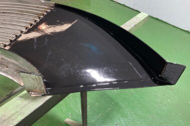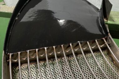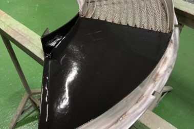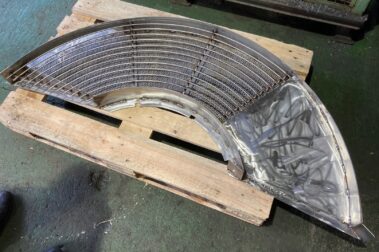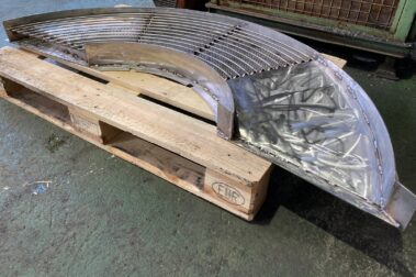Nos desplazamos hasta sus instalaciones para tomar medidas de la máquina y realizar posteriormente los planos correspondientes. Una vez con el plano sobre la mesa, se pidieron los materiales pertinentes para proceder a su fabricación. Se optó por varilla para la que la salida o salto por encima del abrasivo fuera más ágil por la geometría del mismo y chapa perforada por debajo para el paso de las piezas. Por último, se recubrió la zona de la rampa con un poliuretano especial antiabrasivo para evitar el desgaste de la zona.