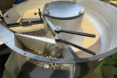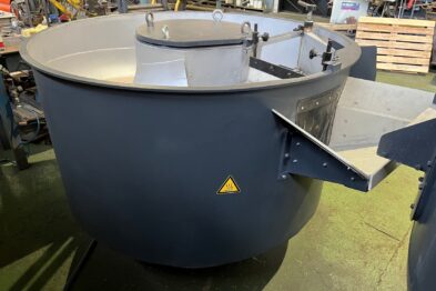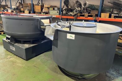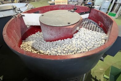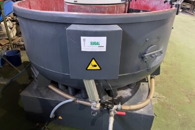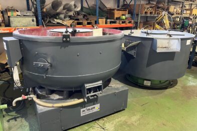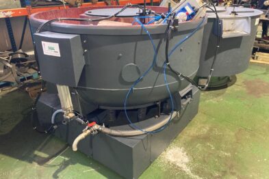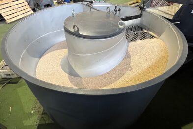 Equipo de vibrado y secado de gran capacidad formado por vibrador circular Rösler Rotofinish ST 22 TM y secadora de maizorb Alma A460 SCA