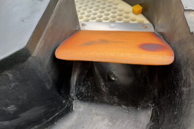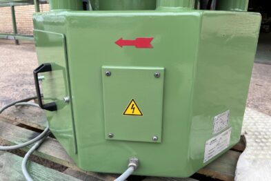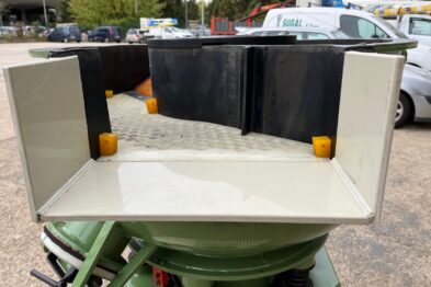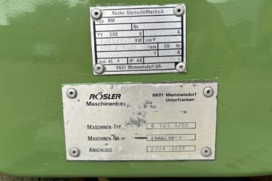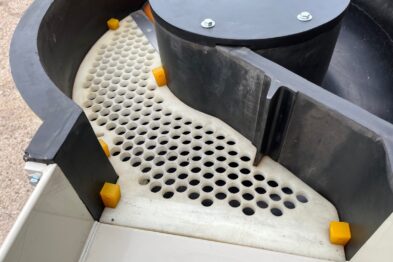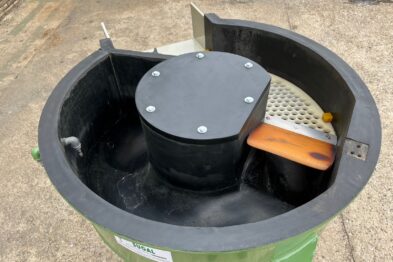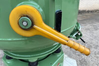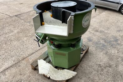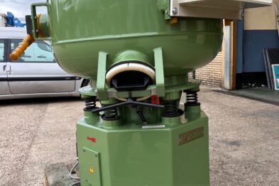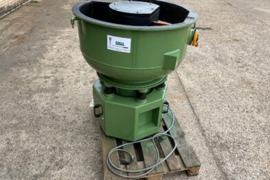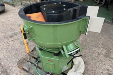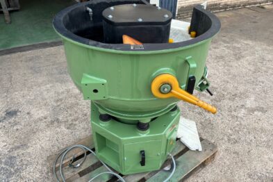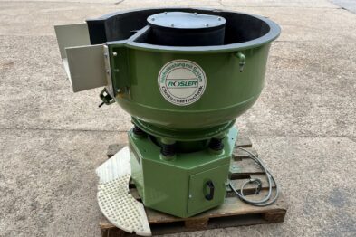 Vibrador circular Rösler R105 A/SM de 105 litros de capacidad. Sistema de descarga de piezas semiautomático mediante palanca.
