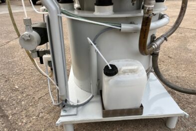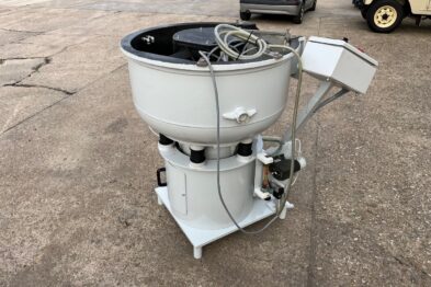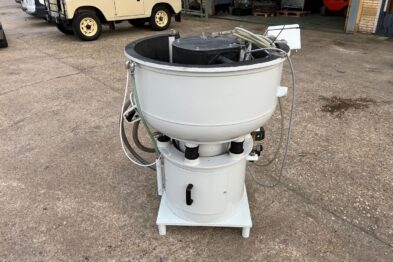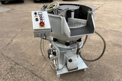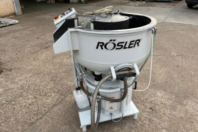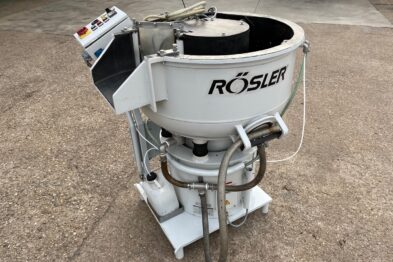 Vibrador circular para el pulido de piezas Rösler R125 EC de 125 litros de capacidad. Sistema de descarga de piezas semiautomático mediante portillo de separación.