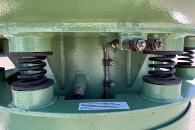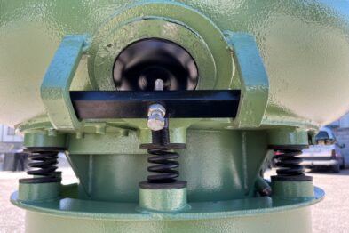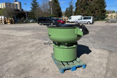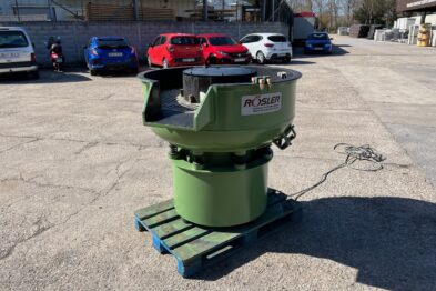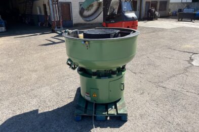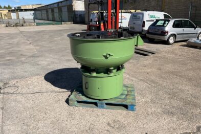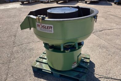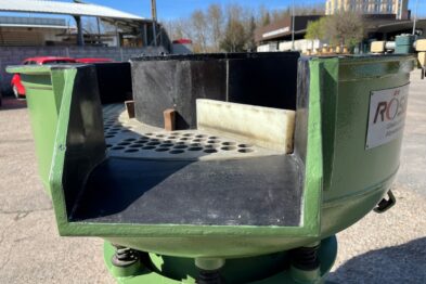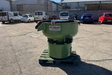 Vibrador circular para el pulido Rösler R185 EC 185 litros de capacidad. Sistema de descarga de piezas semiautomático mediante portillo de separación.