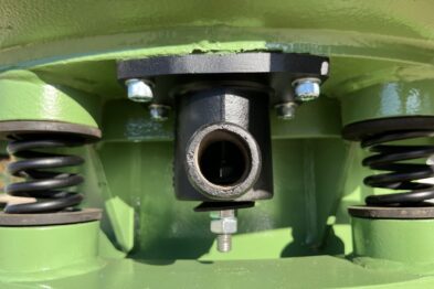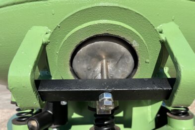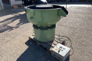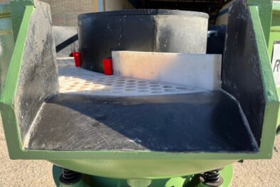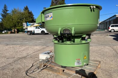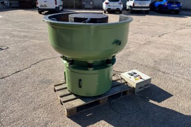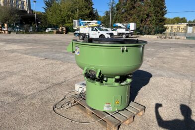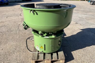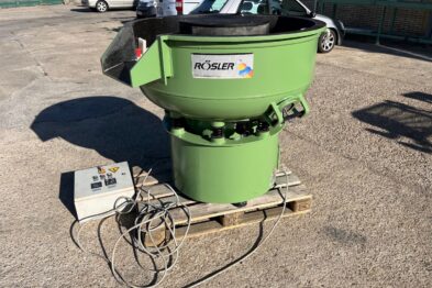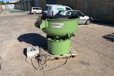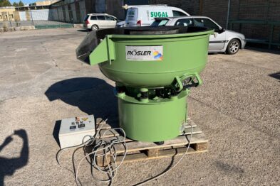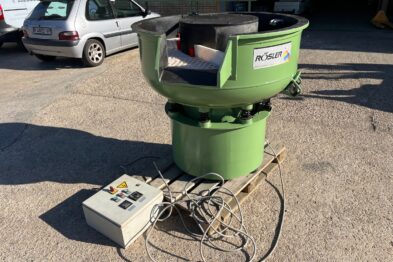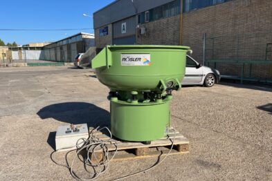 Vibrador circular para el pulido de piezas Rösler R220 EC de 220 litros de capacidad. Sistema de descarga de piezas semiautomático mediante portillo de separación.