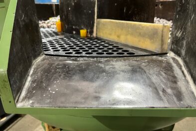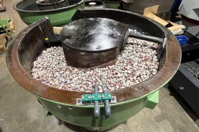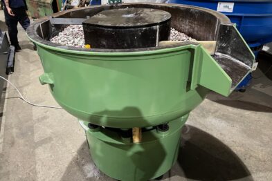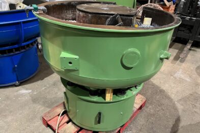 Vibrador circular para el pulido Rösler R320 EC 320 litros de capacidad. Sistema de descarga de piezas semiautomático mediante portillo de separación.