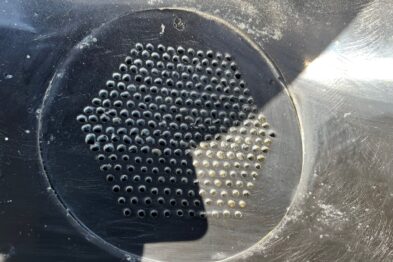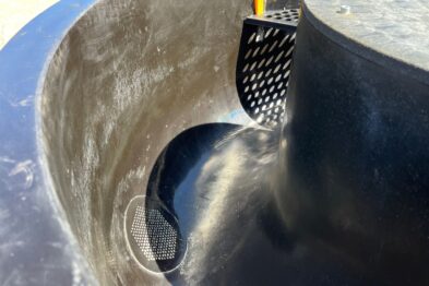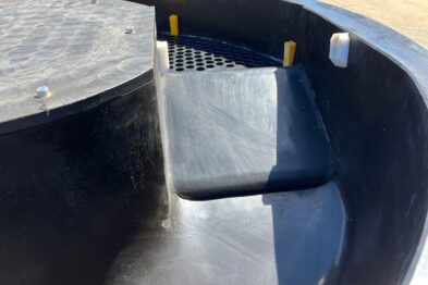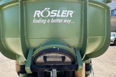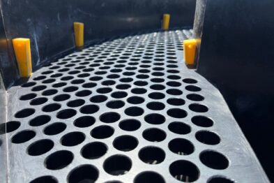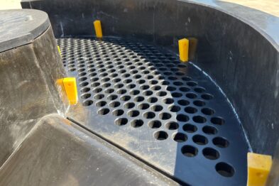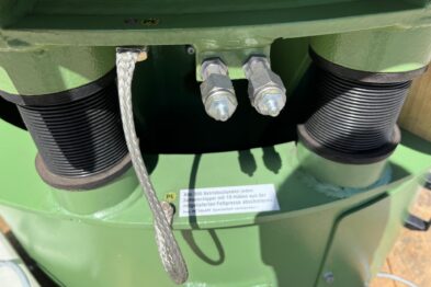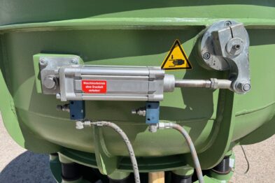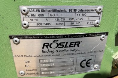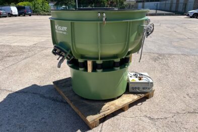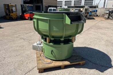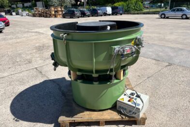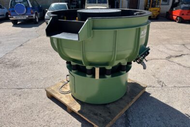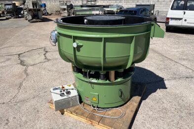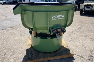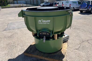 Vibrador circular de pulido Rösler R420 EURO con descarga automática de piezas mediante cilindro neumático. Recubrimiento en poliuretano.