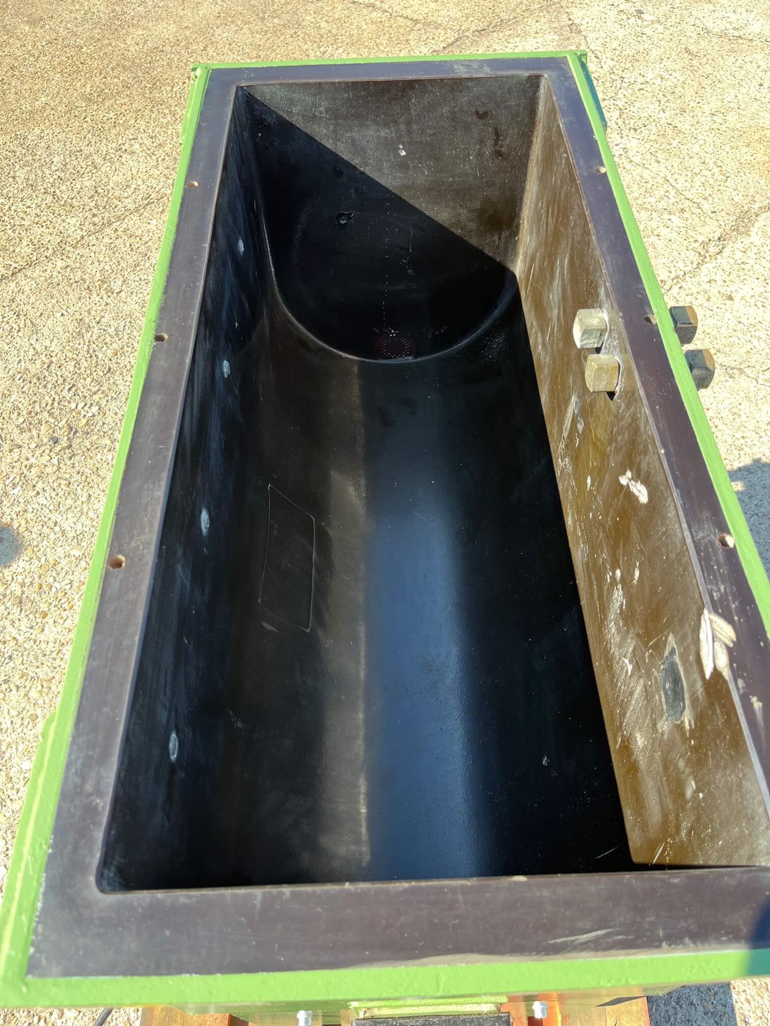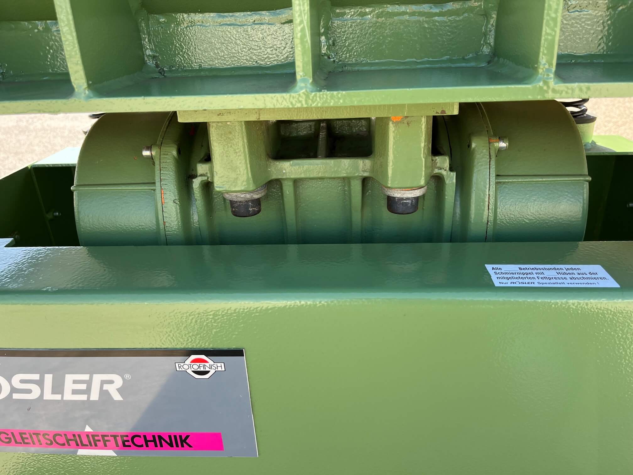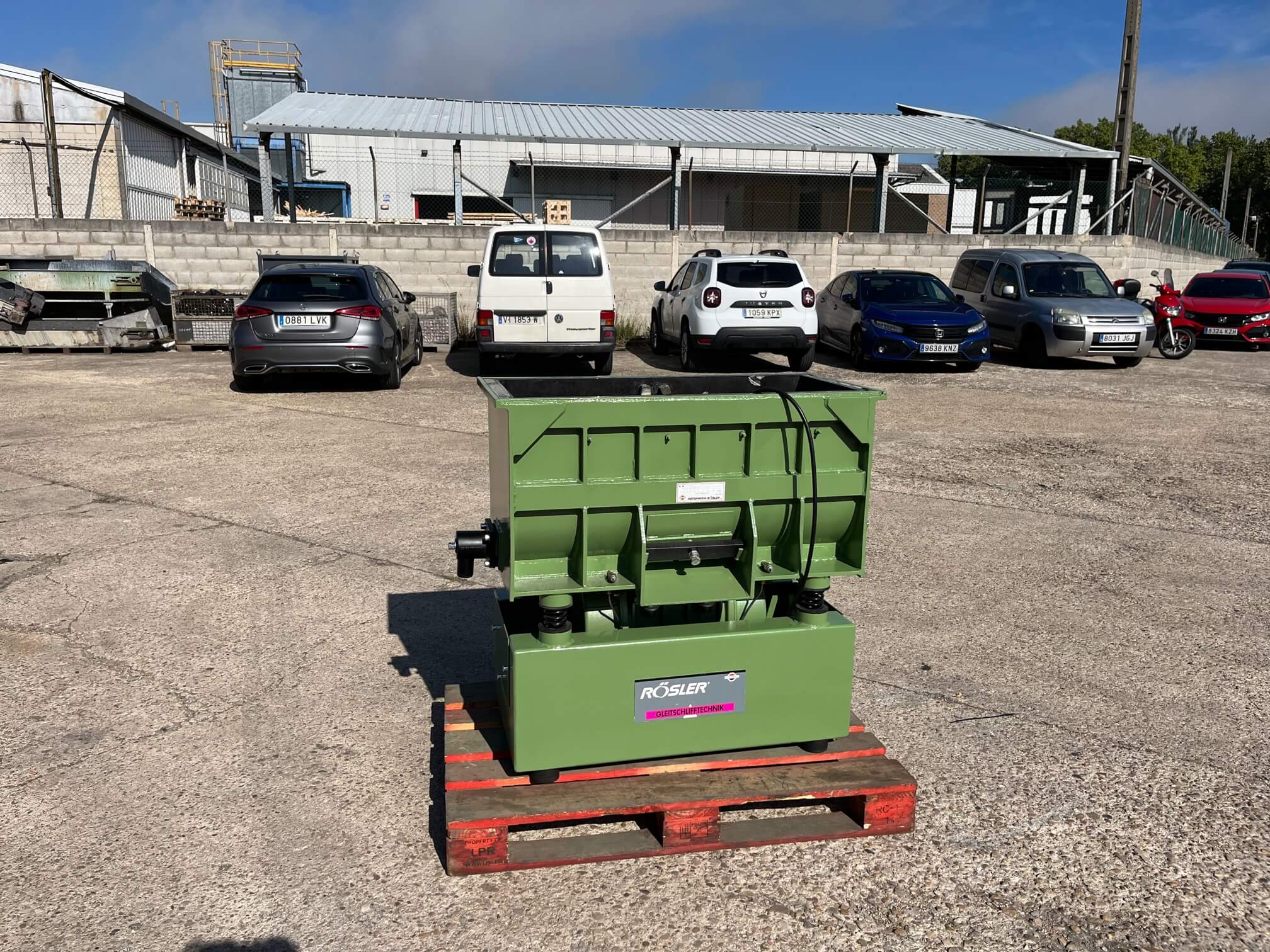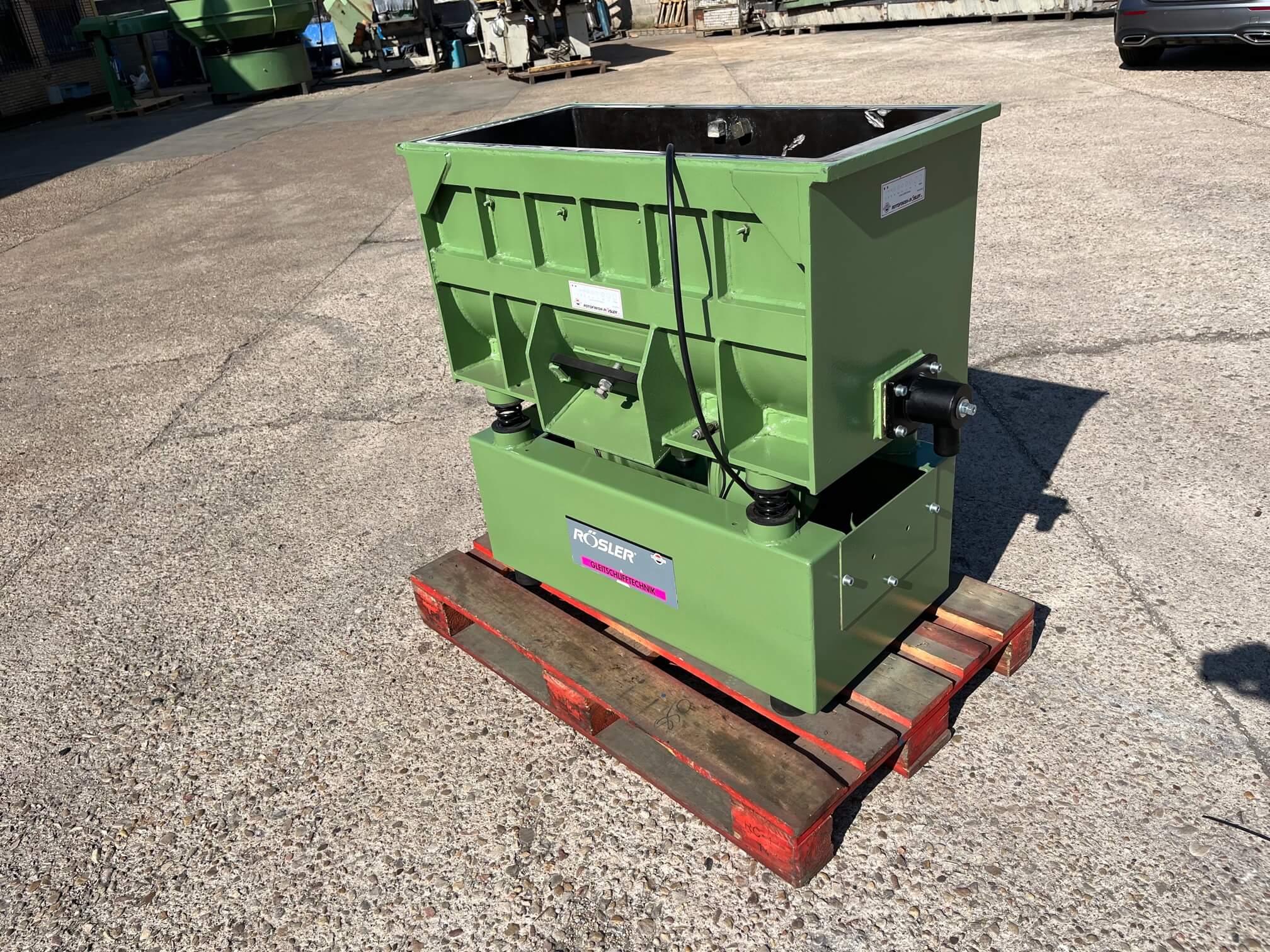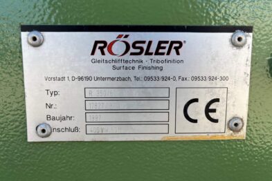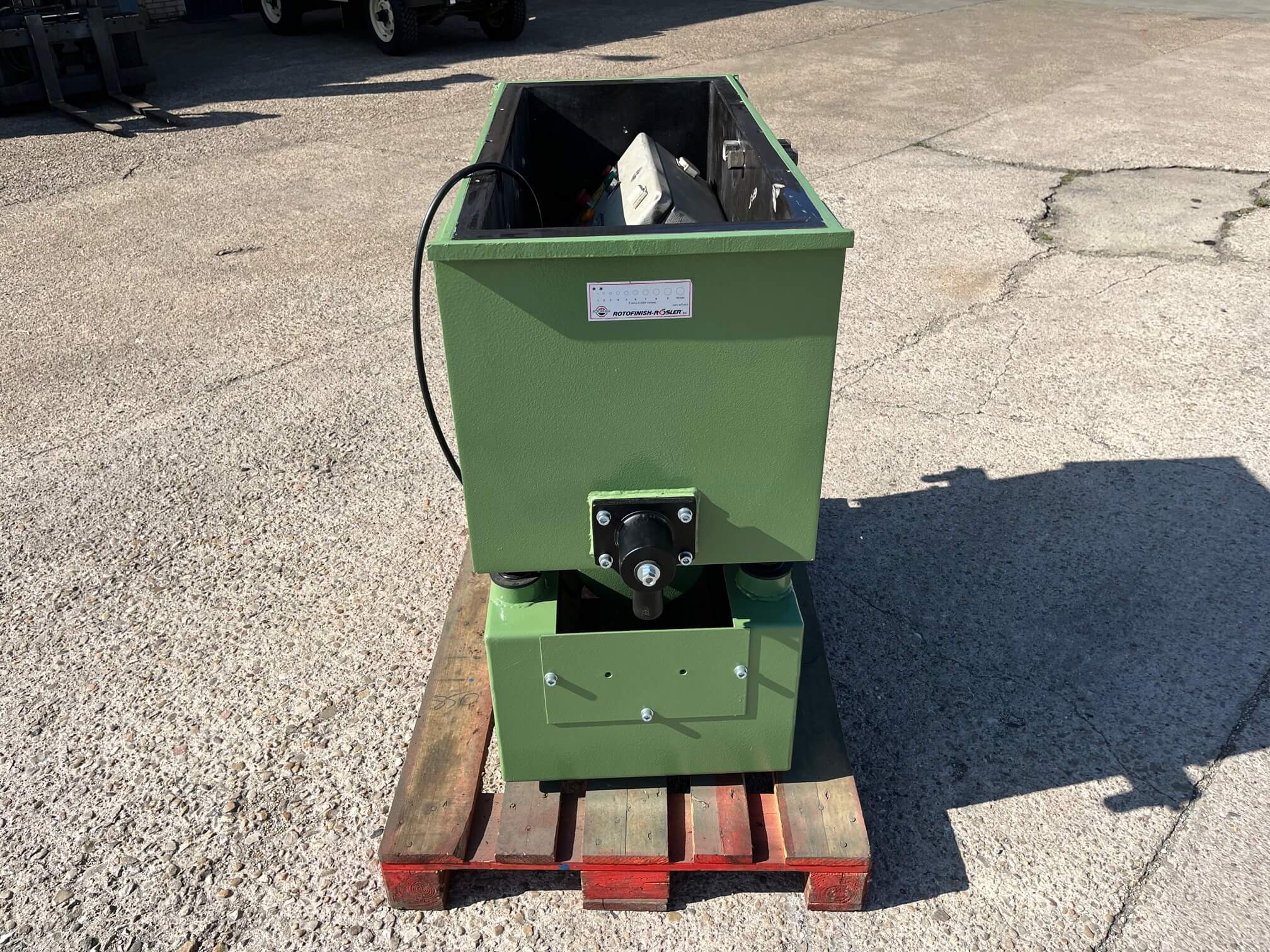Vibrador de pulido lineal Rösler R350/870 TE-15 de 125 litros de capacidad con recubrimiento en poliuretano. Motor debajo de la cuba.