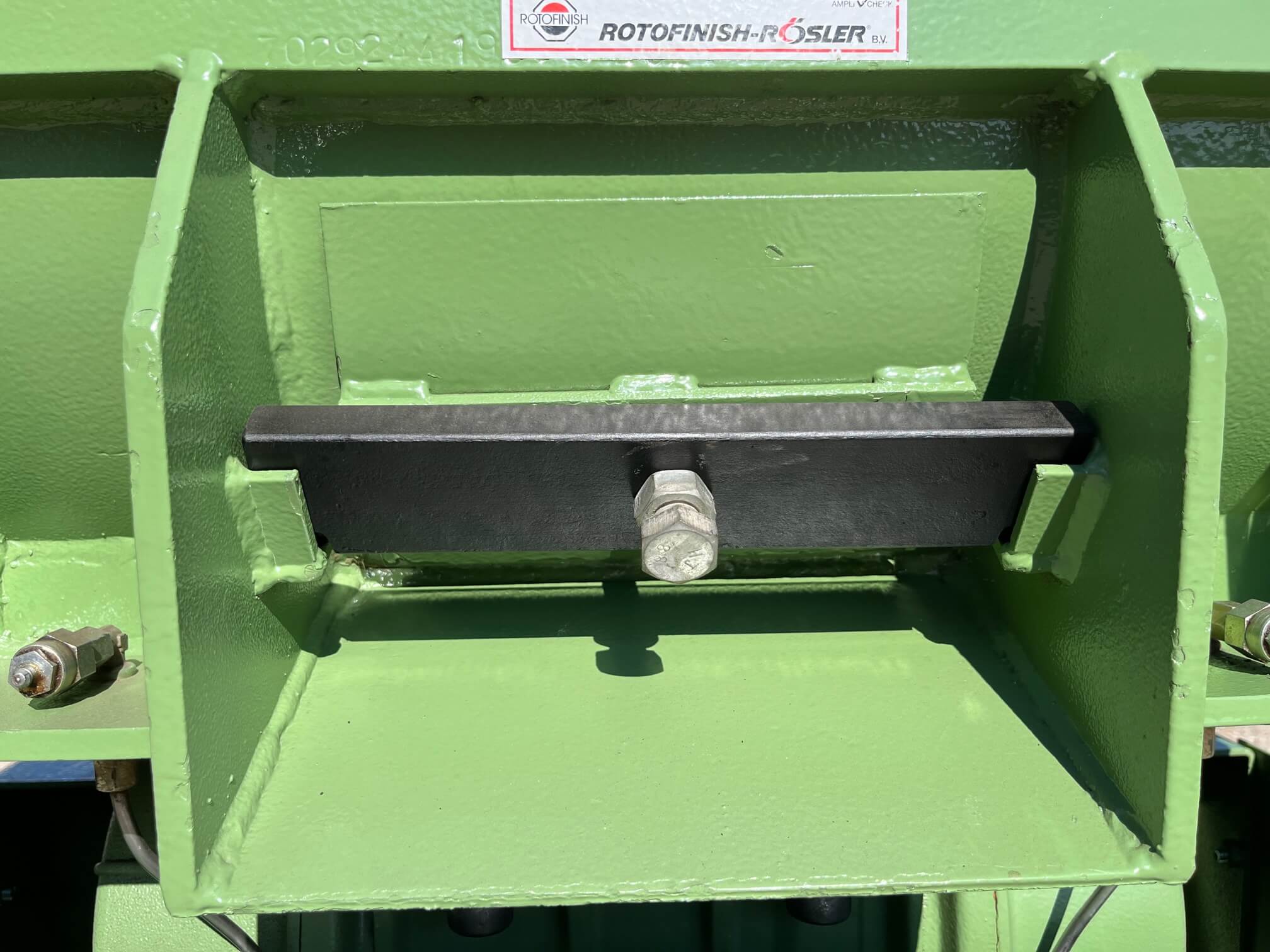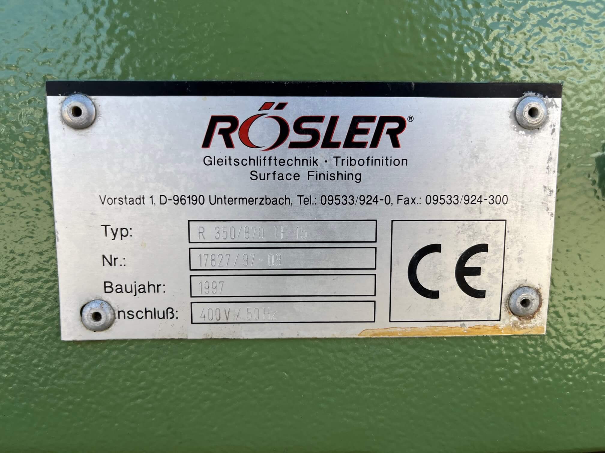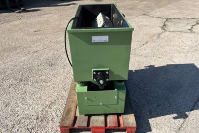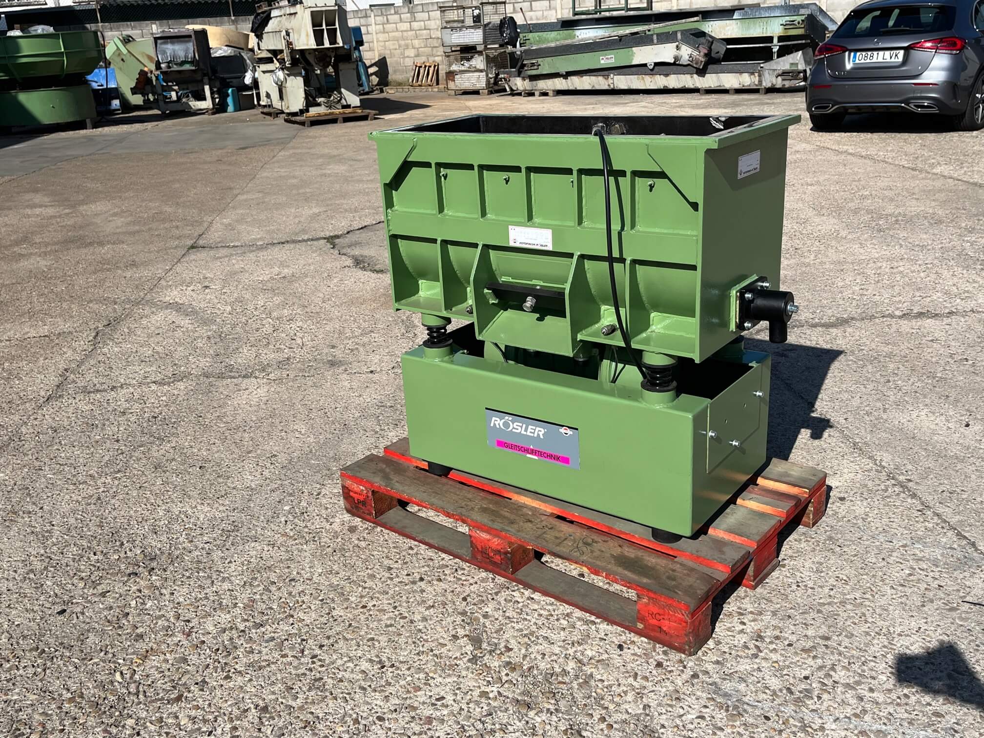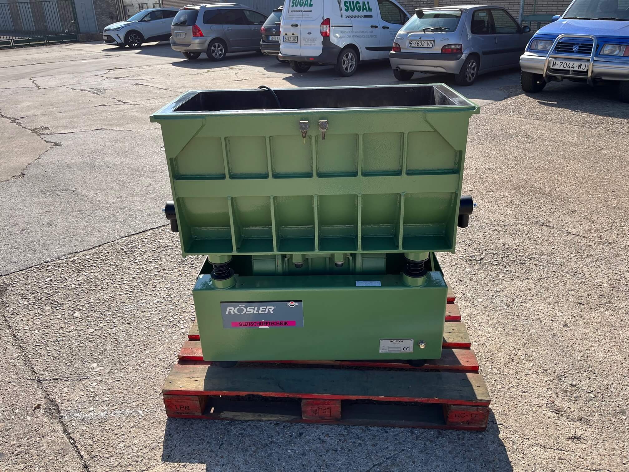 Vibrador de pulido lineal Rösler R350/870 TE-15 de 125 litros de capacidad con recubrimiento en poliuretano. Motor debajo de la cuba.