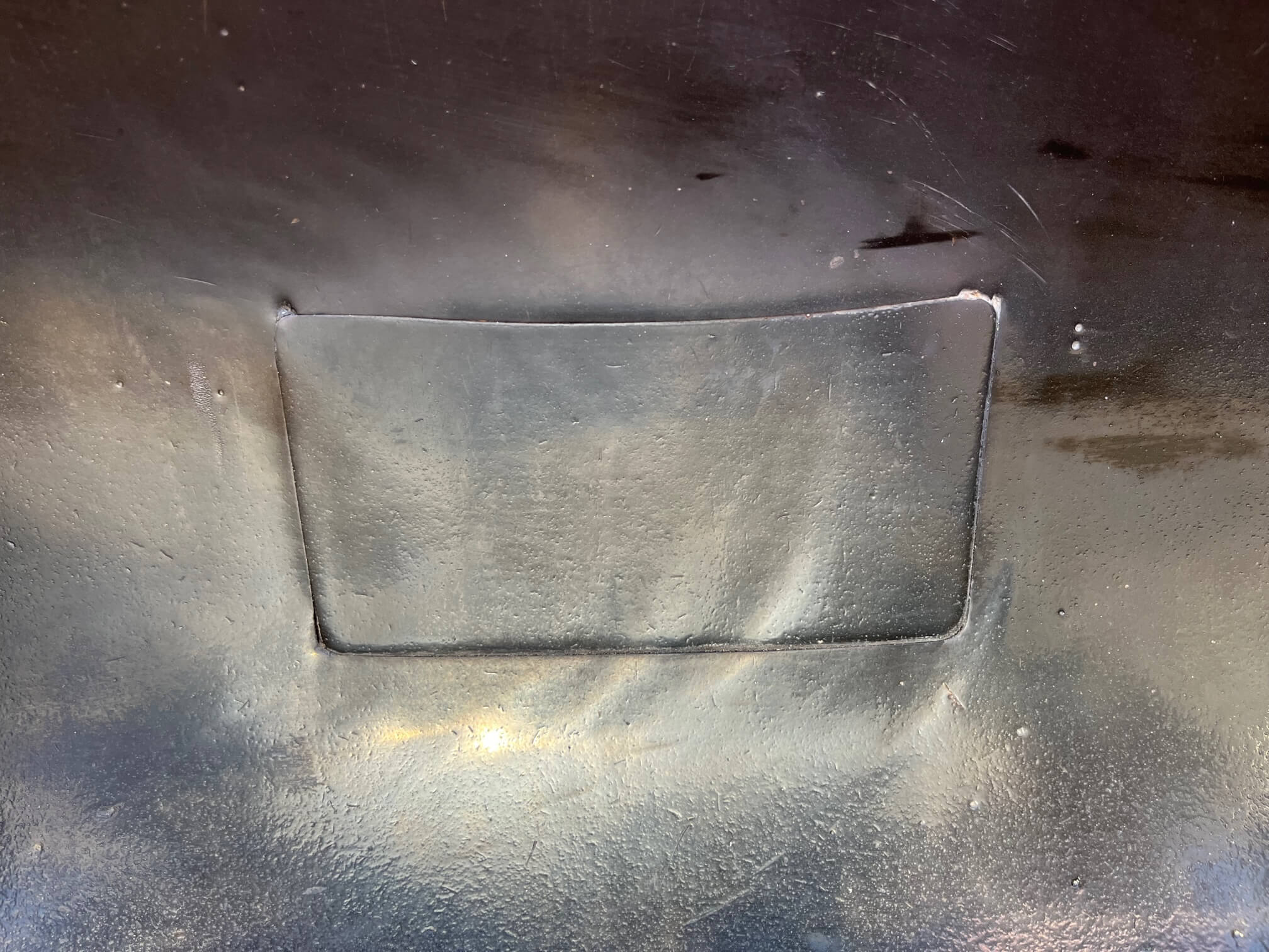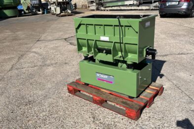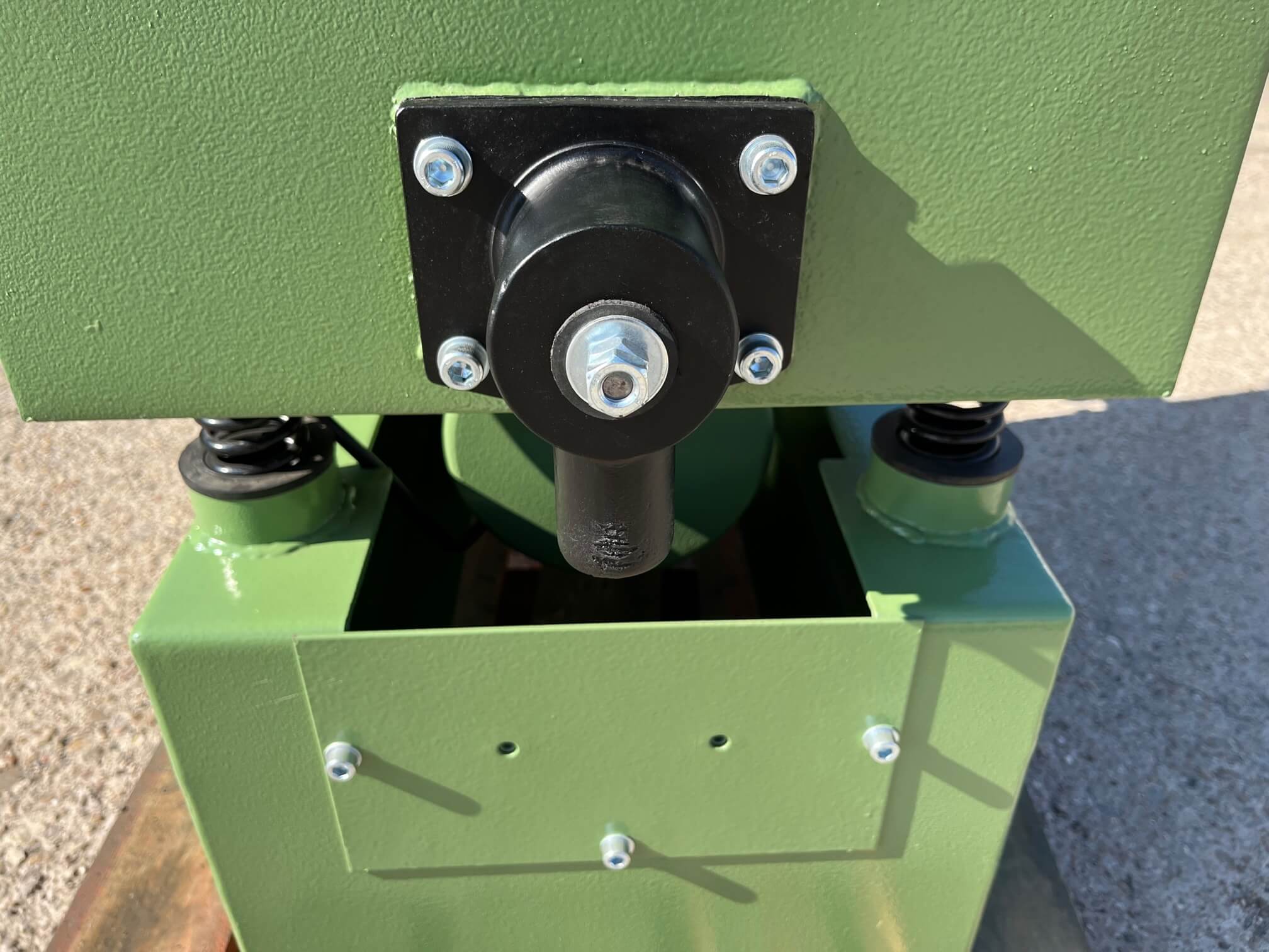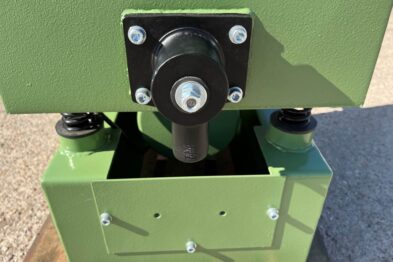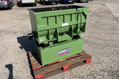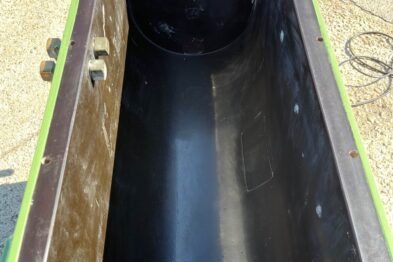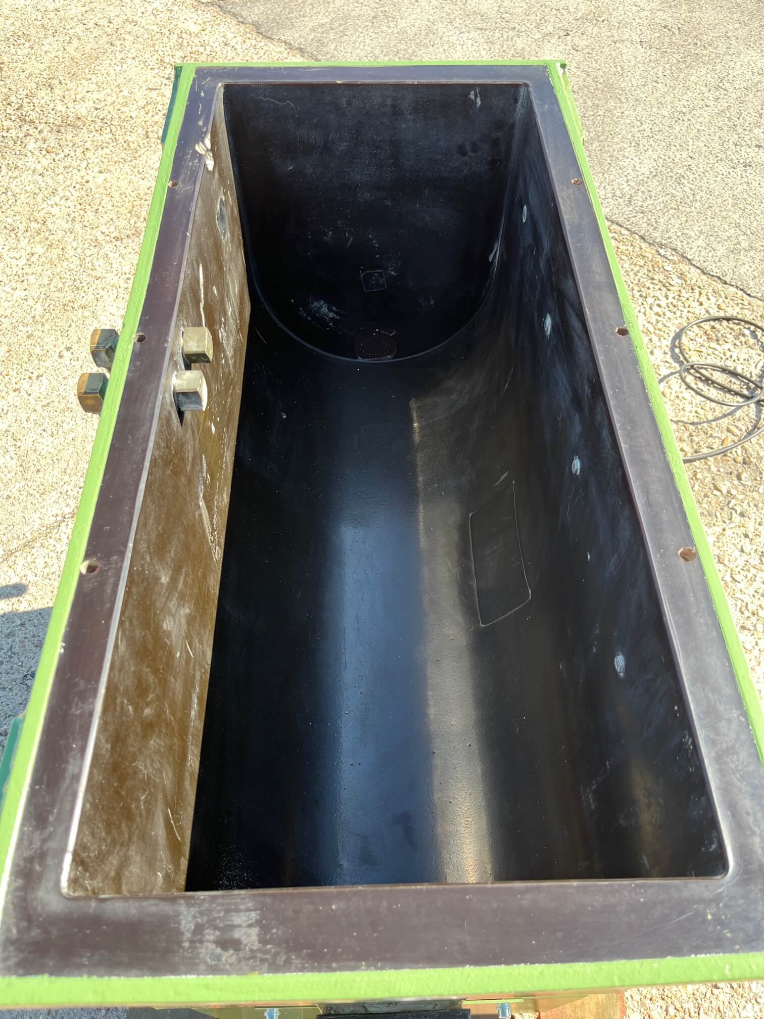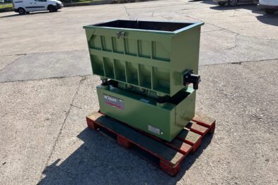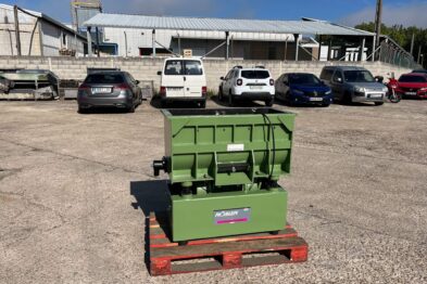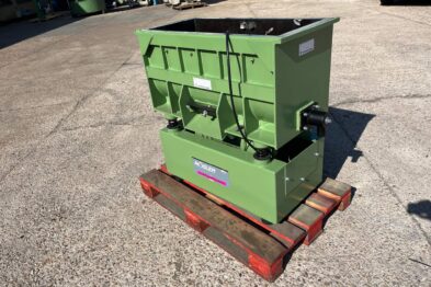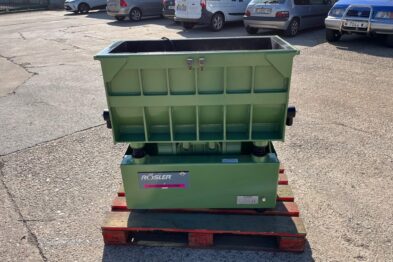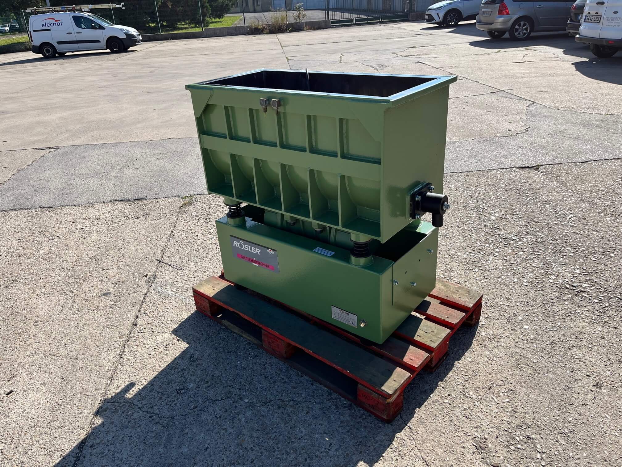 Vibrador de pulido lineal Rösler R350/870 TE-15 de 125 litros de capacidad con recubrimiento en poliuretano. Motor debajo de la cuba.